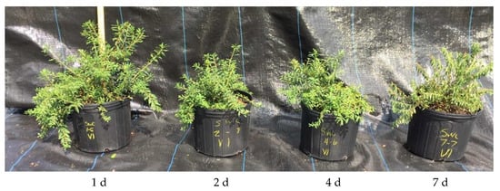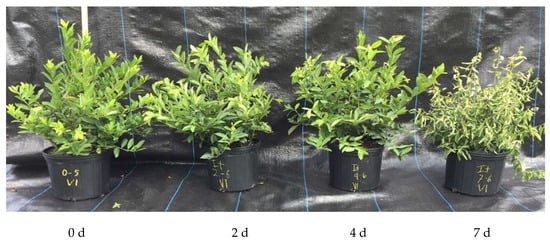 Following the collection of hyperspectral images, one plant was randomly selected from each water stress level for each plant taxa and photographed as shown in Figure 2, Figure 3, Figure 4 and Figure 5.