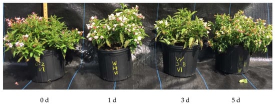 Figure 5. Photographs of one plant randomly selected from each water stress level for weigela following the collection of hyperspectral images.