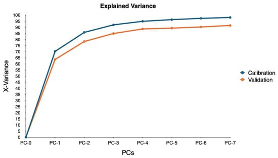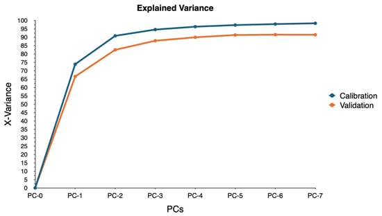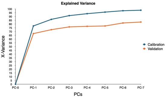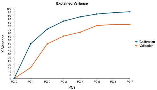 In the validation dataset, a similar trend is observed but with slightly lower explained variances, signifying a minor drop in predictive accuracy. PC-1 explains 16% of the variance, which grows to 50% by PC-2 and 61% by PC-3. By PC-7, the cumulative variance reaches 77%. This difference between calibration and validation datasets highlights some degree of model variability, possibly indicating the model’s sensitivity to variations in data or suggesting further refinement for optimal predictive performance.