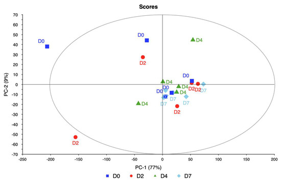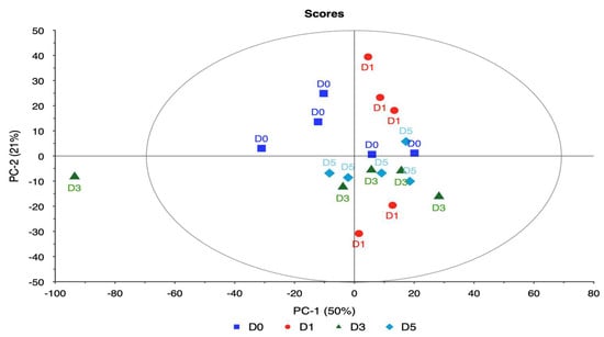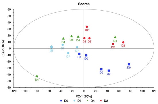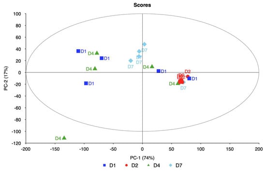 Figure 14. Score plot showing the separation of itea plants by water stress levels (D0, D2, D4, D7) across PC-1 and PC-2.