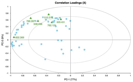 Figure 11. Correlation loadings plot for rose, showing key spectral bands (510.318, 538.096, 629.431, 762.124, 769.287, and 832.369 nm) associated with water stress responses along PC-1 and PC-2.