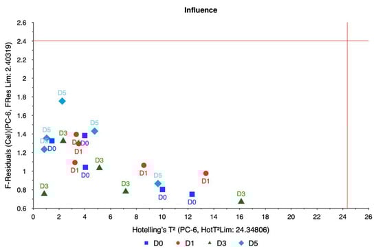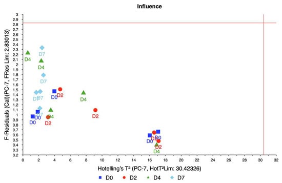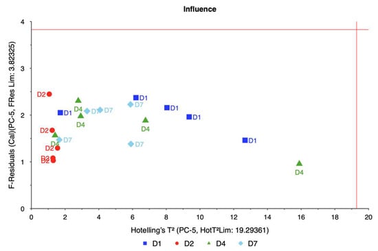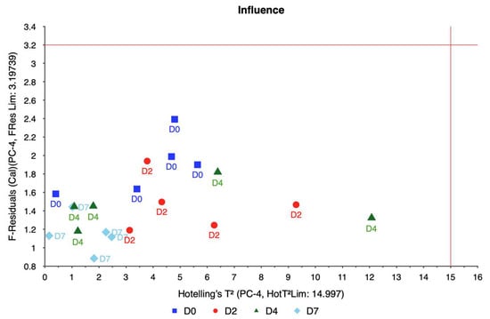 The influence plot (Figure 12) for rose illustrates the distribution of samples across Hotelling’s T2 values on the x-axis and F-residuals on the y-axis, with data points categorized by day of measurement (D0, D2, D4, and D7) to reflect varying stages of water stress. This visualization reveals the variability and potential outliers within the dataset, providing insight into plant responses under different conditions.