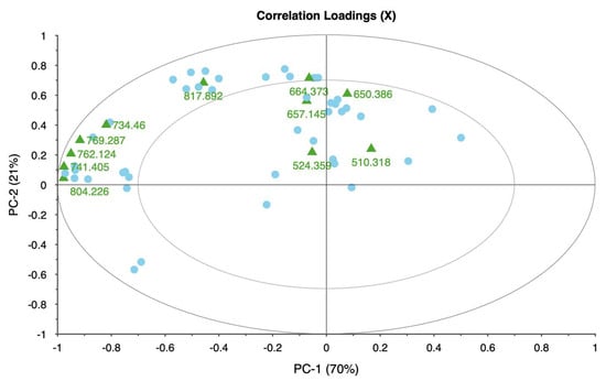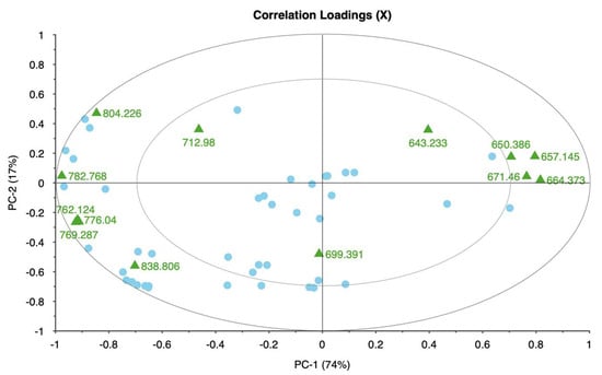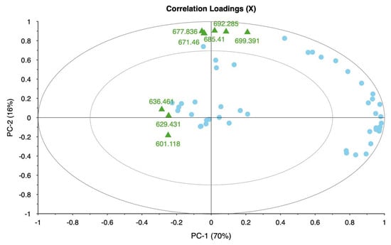 Figure 23. Correlation loadings plot for weigela showing the influence of different spectral bands on the first two principal components (PC-1 and PC-2), highlighting key wavelengths contributing to data variance and structure.