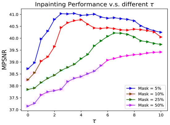 In this section, we examine the effectiveness of both sparsity and low-rank constraints in our proposed LRS-PnP algorithm. Figure 2 shows the inpainting performance of LRS-PnP over different for different masks (in percentages), where is defined as the ratio of the weight of the sparsity constraint and the low-rank constraint. For example, means that the sparsity constraint is disabled, and mask = 50% means that 50% of the pixels are missing. We can conclude from the results that (1) the LRS-PnP algorithm works better with both low-rank and sparsity constraints, as using either an overwhelming sparsity constraint or a low-rank constraint alone tends to reduce inpainting performance, and (2) when the percentage of missing pixels increases, more weight should be placed on the sparsity constraint in order to achieve high-quality reconstruction. On the one hand, approximation errors may be introduced in the sparse coding step; i.e., step (5) in Algorithms 2 and 3. These errors can potentially be suppressed by the constraint of low rank. On the other hand, the sparsity constraint exploits the spectral correlations; i.e., the performance will be enhanced if spatial information is considered.