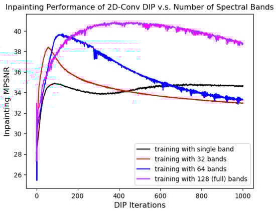In the original LRS-PnP-DIP Algorithm [20], we propose solving the low-rank minimization problem using DIP instead of the traditional SVT projection. A natural question arises: does the DIP (e.g., the architecture proposed in Figure 1) effectively capture the redundancies in the spectral domain? This is empirically justified in Figure 3, where we trained DIP on the corrupted HS image with varying numbers of spectral bands as input and output. The results show that the inpainting performance of DIP improved substantially when more spectral bands were utilized during training; the peak MPSNR was obtained when the neural network saw the entire 128 bands of the input HS images, rather than each single band individually. This finding is counterintuitive since DIP with 2D convolution is generally expected to handle only the spatial correlation of input HSIs. Similar observations have been reported in [10,48], where the authors confirmed that DIP with 2D convolution implicitly explored the channel correlations, possibly due to the upsampling layers in the decoder part that manipulates the HSI channels in the spectral domain.