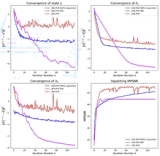 (Convergence of LRS-PnP-DIP(1-Lip) in the Lyapunov Sense). If both Assumptions 1 and 2 hold, with penalty μ, and with an L-Lipschitz constrained DIP (), then there exists a non-increasing function, , such that all trajectories generated via LRS-PnP-DIP(1-Lip) are bounded, and that as , , , and ; i.e., even if the equilibrium states of , α, and are perturbed, they will finally converge to , , and , respectively. The proposed LRS-PnP-DIP(1-Lip) algorithm is, thus, asymptotically stable.