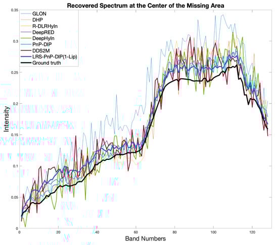 As was reported in a series of DIP-related works [10,11,24,50], the performance of DIP is sensitive to the structure of the neural networks. Table A5 provides a comparative analysis of several network architectures, including ResNet 2D/3D, U-Net 2D/3D, and Skip-Net 2D/3D. Empirical results indicate that Skip-Net 2D (i.e., a U-Net architecture with skip connections and 2D convolution layers) achieves the best performance for the HSI inpainting task. Hence, Skip-Net 2D was selected and implemented as the backbone architecture for the proposed LRS-PnP-DIP, LRS-PnP-DIP(1-Lip), and all other competing methods in the comparative analysis. Furthermore, it was found that ResNet architectures yield inferior results within the proposed framework, highlighting the importance of network design choices for achieving optimal inpainting performance. We left the exploration and identification of the most suitable DIP network structure for HSI inpainting as a future research direction.