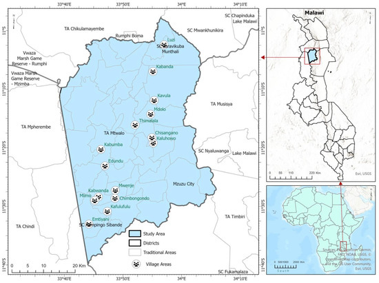 The study area (Figure 1) is the Mzimba District in northern Malawi, which is considered one of the country’s most vulnerable regions to the adverse effects of climate change [26]. Malawi is located between latitudes 9° and 17° south of the equator and is characterized by features such as Lake Malawi and the Great Rift Valley. The Mzimba district covers an approximate land area of 10,400 km2 and a population of 940,184 [27]. The climate of Mzimba is mainly sub-tropical, with average monthly maximum temperatures between 27 °C and 33 °C and annual rainfall varying between 600 mm in the rift valley floor and about 1600 mm in the mountainous areas [28]. Mzimba is part of the Miombo woodlands biome, which is characterized by subtropical savanna and shrubland [29].