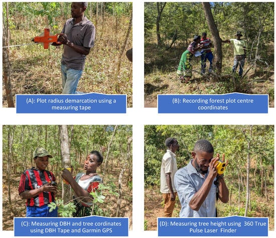 The participants inventoried each plot by measuring the diameter at breast height (DBH), approximately 1.37 m above the ground, using a DBH tape measure, as required in standard forestry practices [39]. Tree height was measured using a True Pulse 360 laser range finder. Participants identified tree species in their local languages, which were translated into their respective scientific names. Community members also used a Garmin GPS receiver to record the center coordinate of each plot. After each plot measurement, a random sample of trees was remeasured by a different participant to assess the accuracy of height, location, and DBH data.