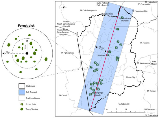 Illustration of the implementation of forest plots sampling in the study communities. The red line indicates the centre of the belt transect.