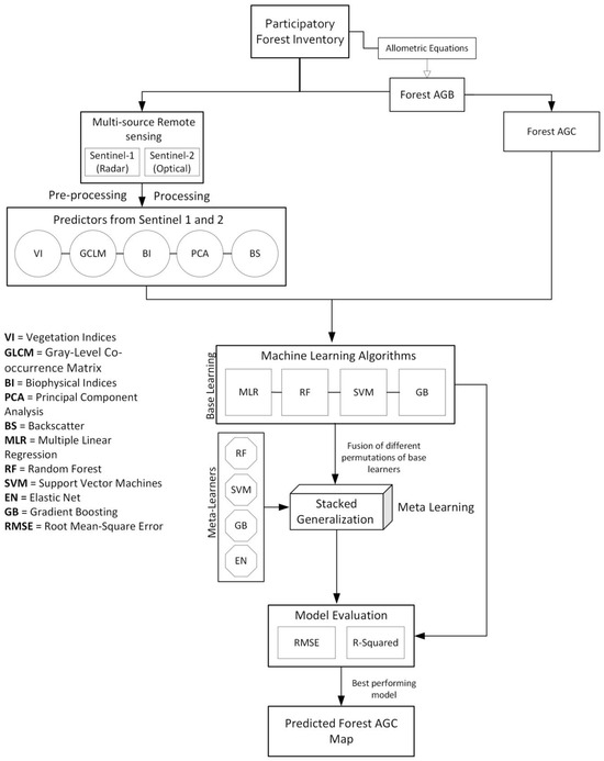 Although field-based forest inventories remains essential for forest carbon stock estimation, remote sensing technologies are increasingly utilized to extend forest carbon monitoring to landscape scales. Radar and optical remote sensing, for instance, have proved to be useful in estimating the above-ground biomass (AGB) and AGC of tropical forests [15,16,17]. The use of remote sensing presents opportunities to reduce the labour requirements and costs associated with field-based methods and increase the spatial coverage over macro landscapes [18,19]. However, there are challenges associated with using remote sensing data for forest carbon assessment in SSA, including image quality issues due to environmental factors such as cloud covers [20] and sensor errors [21]. Nevertheless, integrating remote sensing and machine learning methods has become popular in estimating forest AGB and AGC stocks. These methods include random forest, support vector, gradient boosting, and neural networks [22,23,24,25]. We hypothesize that complementing the spatial coverage of remote sensing data and meta-learning analysis with locally generated forest field data would significantly improve forest carbon prediction accuracy.