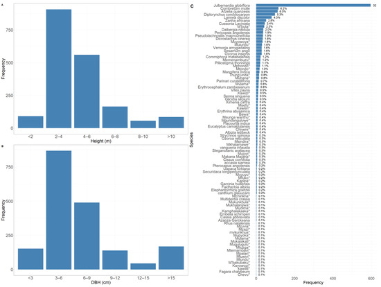 Distribution of the frequency of tree height (A), DBH (B), and species type (C). * Species are labelled in the local name.