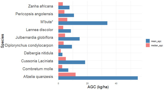 Afzelia quanzensis recorded the highest mean (55 kg/ha) and median (12 kg/ha) AGC. Next was the locally known M’buta with a mean and median AGC of 34 k/g and 6 k/g, respectively, (Figure 6). Dalbergia nitidula recorded the lowest mean and median AGC.