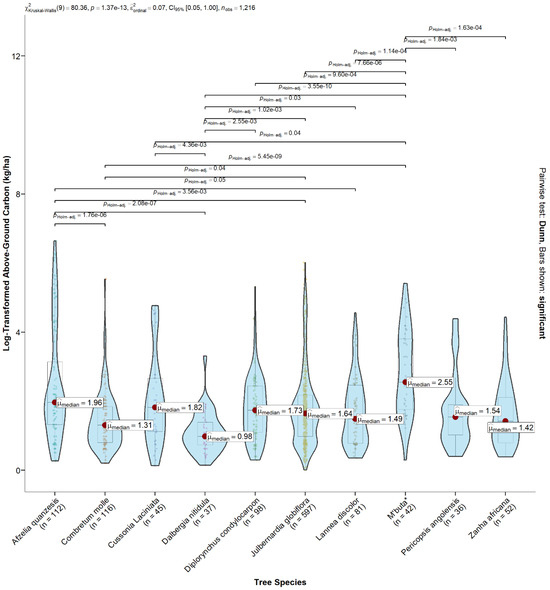We used the Kruskal–Wallis non-parametric test to assess the significant differences in medians among the top 10 abundant tree species (Figure 7). The Kruskal–Wallis test indicates that at least one species’ median AGC is significantly (p = 1.37 × 10−13) different from other species. To further understand the group differences, we performed the Dunn post-hoc analysis, indicating the groups of tree species with significantly different medians (Figure 7). For example, Afzelia quanzensis (P-holm-adj. = 0.05) had a significantly higher median than Combretum molle, Dalbergia nitidula, Julbernagia globiflora, and Lannea discolor (Figure 7). M’buta (P-holm-adj. = 5.45 × 10−9) also had a significantly higher median than all these species (Figure 7).