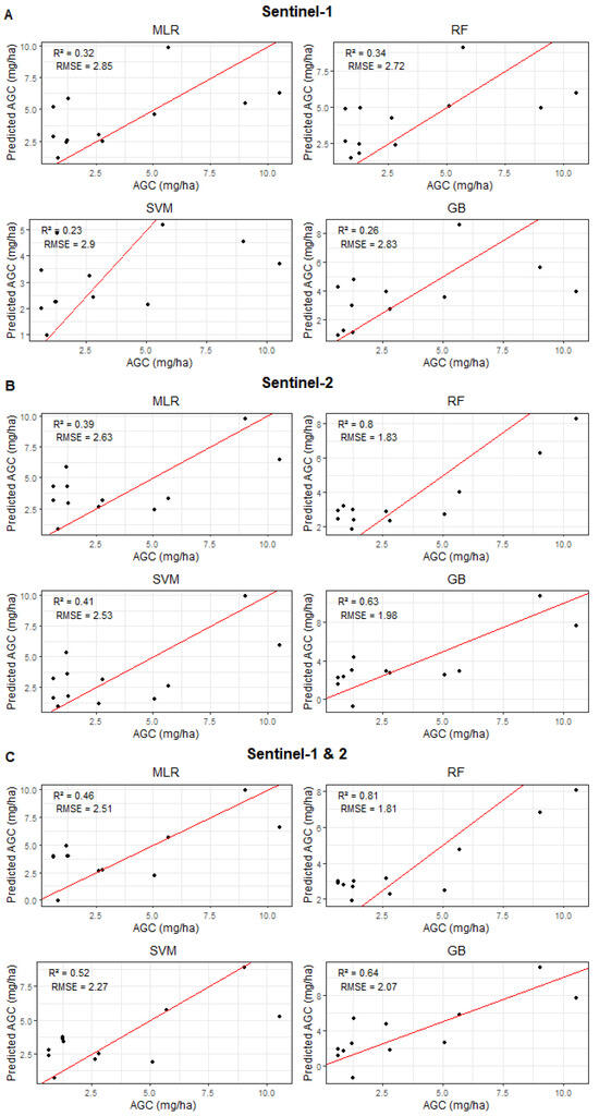 Scatter plots comparing the performance of machine learning regression models in predicting AGC using data Sentinel-1 data (A), Sentinel-2 (B), and both (C).