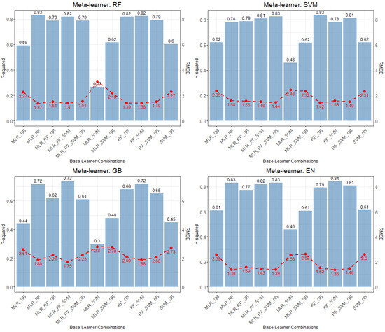 The prediction accuracy of meta-models varied by the combination of base learners and the type of meta-regressor used (Figure 10). Using EN as a meta-learner produced one of the most optimal model performance (Figure 8). When using EN as a meta-learner, a combination of RF and SVM produced the highest accuracy (R2 = 84, RMSE = 1.36). A combination of all the base learners (i.e., MLR, RF, SVM and GB) and MLR and RF had the next-best prediction performance with an R2 and RMSE of 0.83 and 1.39, respectively. Others included MLR, RF, and SVM (R2 = 82, RMSE = 1.43) and RF, SVM, and GB (R2 = 81, RMSE = 1.48). The use of RF and SVM as meta-models also produced optimal model performance. However, using GB as a meta-learner did not improve prediction accuracy.