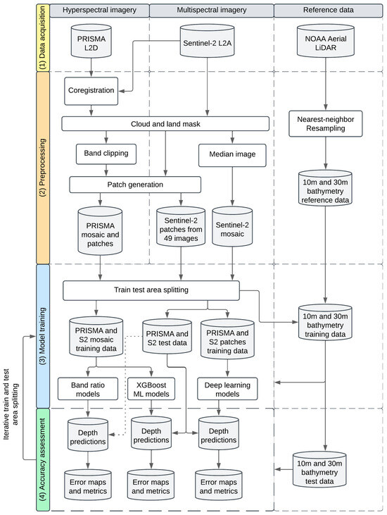 The NOAA LiDAR bathymetry data were resampled to 30 m when used as reference data for PRISMA imagery and to 10 m for the Sentinel-2 imagery. Nearest-neighbor was applied as the resampling technique, as it preserves the sharp edges and boundaries in the data. A drawback of this technique is the potential loss of information. Due to the limited tidal range in the study area of 0.4 m [22], no tidal corrections were applied. Additionally, the median Sentinel-2 composite reduces the influence of tidal variability, approximating a more typical water level condition [17].
