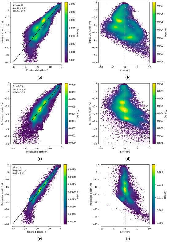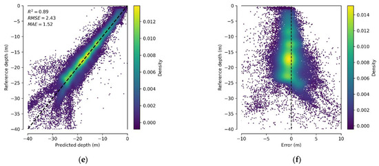 XY plots of the predicted depth (trained with PRISMA) versus the reference depth (LiDAR) and error depth for the models Ma (a,b), XGBoost (c,d) and 2D-3D CNN (e,f). (a) Ma: Reference vs. predicted depth. (b) Ma: Reference depth vs. error. (c) XGBoost: Reference vs. predicted depth. (d) XGBoost: Reference depth vs. error. (e) A 2D-3D CNN: Reference vs. predicted depth. (f) A 2D-3D CNN: Reference depth vs. error. The dashed lines in the figures represent zero errors (1:1 line).