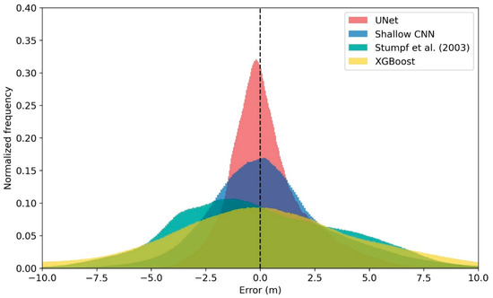 Histograms of predicted depth errors in meters for different models (U-Net, Shallow CNN, Stumpf et al. [4] and XGBoost) with Sentinel-2 imagery. The dashed vertical line represents zero error, with overprediction (predicted depth larger than the LiDAR reference) shown to the left and underprediction to the right.