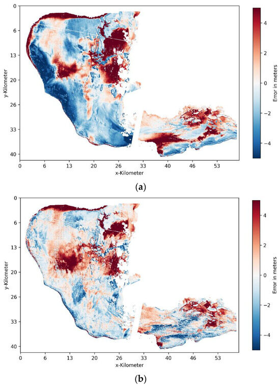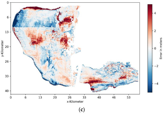 Error maps of predictions from Stumpf (a), XGBoost (b) and U-Net (c) models trained with Sentinel-2 imagery versus the LiDAR reference depth. The visible horizontal lines are artificial and due to spatial train–test splitting from Figure A1. (a) Stumpf predictions error map. (b) XGBoost predictions error map. (c) U-Net predictions error map.