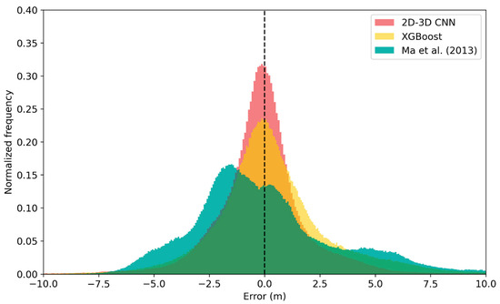 The error maps In Figure 9 show that each of the three models has fairly similar patterns with underpredictions in the turbid water near the outlet of the river and overpredictions in shallow, near-coastal waters. In Figure 9b, XGBoost shows overpredictions for water depth in the deep area in the southern part of the study area, while the other models show underpredictions. An explanation for this has not yet surfaced and might be difficult to find due to the black box character of the models. The error map for the 2D-3D CNN model in Figure 9c shows overprediction in the northern area and like the other models, underpredictions near the river outlet. A histogram of the errors of the PRISMA models’ predictions is presented in Figure 10.