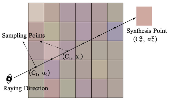 The synthesis process of color values on the raying direction. The colors of the blocks represent the colors of the corresponding pixel points.