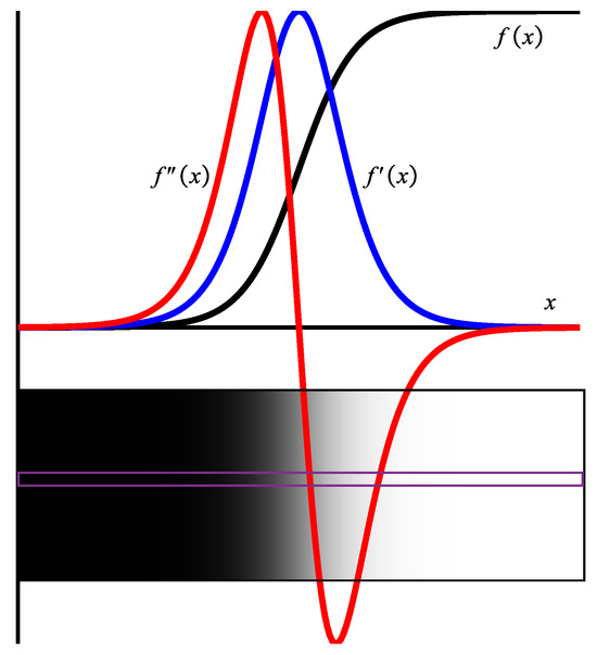 Formulation of transfer functions is a significant area of investigation in three-dimensional data visualization with the ray-casting technique. The primary purpose of the transfer function is to convert scalar values and multidimensional data into color values and opacity. In practical applications, various transfer functions are often designed to enhance data visualization, thereby emphasizing the content of interest [41,51]. The first derivative of scalar data (the gradient) indicates the direction of maximum change of the data, while its magnitude represents the local rate of change of the scalar data. Here, denotes the magnitude of the gradient of , with signifying the scalar function of the data. Moreover, the second-order derivative, denoted as , can more precisely delineate intricate limits. Figure 3 illustrates the optimal boundary between homogenous materials. It shows a grayscale image of a homogeneous substance. We extract a line from the grayscale image and plot the curves of data value, gradient, and second derivative—Figure 3. Figure 3 reveals that the gradient amplitude in the uniform zone is comparatively small but significantly larger in the variable region; at the boundary, the gradient is high, and the second derivative is null.