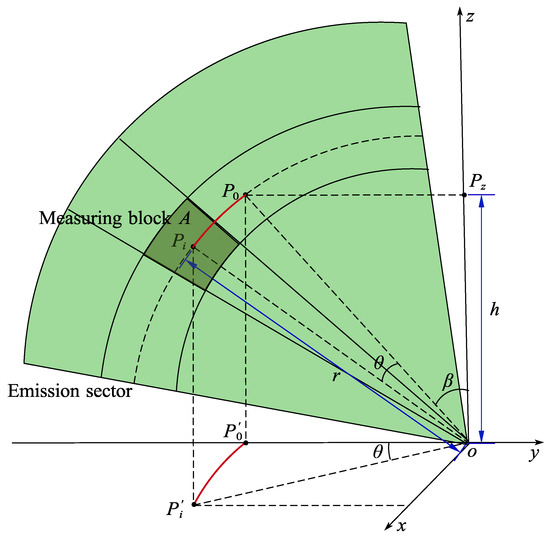 The schematic diagram of the transmitting sector in the Cartesian coordinate system is shown in Figure 4. Note that the origin of the rectangular and polar coordinate systems coincide. The transmitting sector is symmetric about the plane; i.e., a beam with a receiving angle of is projected on the y-axis. A measuring block is A on the transmitting sector whose geometric center is and radial distance is r. At the same radial distance, the point on the beam that corresponds to point is . The projection of point onto the z axis is . The projection of arc onto the plane is arc . Hence, the conversion relationship between a polar coordinate system and a Cartesian coordinate system can be formulated as: