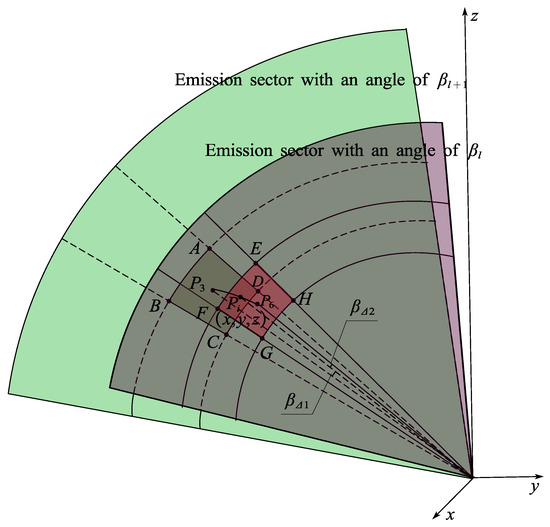 According to (15), the polar coordinate can be derived from the Cartesian coordinate . The transmitting angle is ; within a certain transmitting angle sector, the receiving beamforming angle is ; and the radial distance of all layers is . M, N, and L represent the number of transmission angles, the number of reception beam angles, and the number of layers into which the radial distance is divided, respectively. The nearest transmitting angle , receiving beam angle , and radial distance are found, respectively, at point , as shown in Figure 5 and Figure 6. Figure 5 shows the emission sector with an angle of . Thus, the following relation can be obtained: