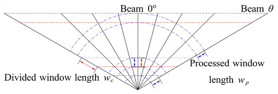 The transmitting array of the MBES was configured as a curved array, which resulted in a transmitting sector characterized by wide coverage. Beamforming technology was used to acquire time-domain signals at various beam angles. Layering of time-domain signals was conducted depending on the pulse width of the transmitted signal. Equal window-length layering method is used in the proposed method, as illustrated in Figure 7. The red dashed line illustrates equal-depth layering. The window length of the beam is denoted as . As the beam angle’s absolute value increases, the window’s length increases correspondingly. In order to balance and , it is necessary to consider the overlap rate between layers and the signal utilization rate within the layers. Equal window-length layering method is used in the proposed method, as illustrated by the blue dots in Figure 7. Beam angles were classified according to uniform processing-window lengths, which facilitates the thorough use of signals within the layer.
