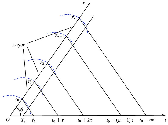 The processing-window length depends on the pulse width of the transmitted signal , , so the layer thickness over the radial distance is . After beamforming, the layering mode of the time-domain signal is shown in Figure 8. The two coordinate axes were time t and radial distance r, respectively, and the angle between the two coordinate axes was , i.e., the time-domain signal waveform with the beam angle of . represents the interval between two adjacent transmissions, and signifies the time for the MBES to receive the echo signal from the radial distance of . The layer thickness of the unit layer is , where N denotes the number of layers.