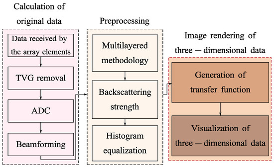 The processing workflow of the proposed algorithm is illustrated in Figure 10. Initially, the original data collected by the MBES are processed to obtain the time-domain signals after beamforming. Preprocessing operations are then performed, including layering, backscattering strength computation, and histogram equalization. Finally, three-dimensional data are visualized using the generated opacity transfer function. Section 4 presents a detailed analysis of the simulation performance of the algorithm and the validation results based on experimental data.
