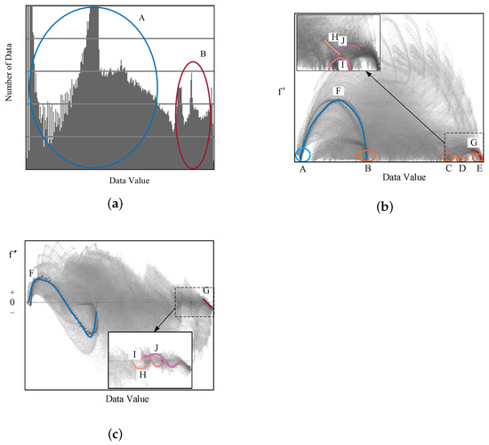 Statistical chart. (a) Histogram of data value. (b) Gradient magnitude versus data value f. (c) Second derivative versus data value f.