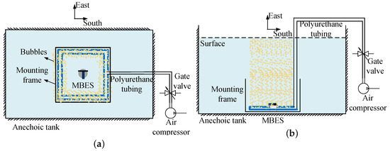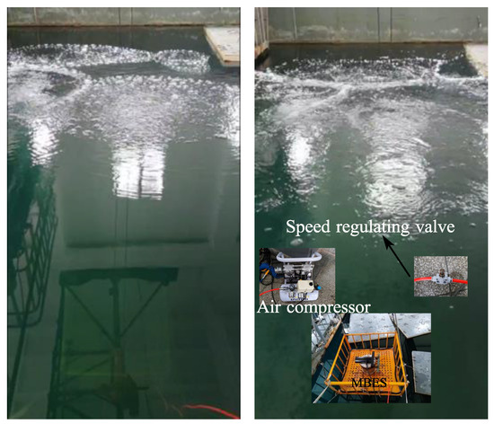 In order to assess the efficacy of the proposed algorithm, the subsequent experiments were devised. The schematic representation of the experimental setup within an anechoic tank is illustrated in Figure 16. The utilized equipment includes an MBES, a nano microporous aeration tube, a polyurethane (PU) tube, a speed regulating valve, an air compressor, and a mounting frame. We positioned the aeration tube and MBES within the mounting frame, as illustrated in Figure 17. The MBES was centrally located within the mounting frame. In contrast, the aeration tube was secured along the bottom edge of the frame. The size of the mounting frame was , and it was situated at the base of the pool. The PU tube was linked to a central speed-regulating valve to modulate the size and quantity of bubbles. The air compressor was utilized to produce bubbles. As shown in Figure 16, we positioned the placement frame at the bottom of the pool, activated the air compressor, adjusted the speed control valve to a specified setting, and the aeration tube produced high-density microbubbles.