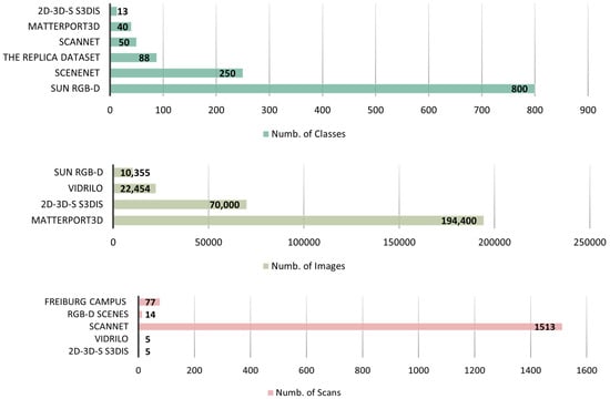 Most of the indoor 3DSS datasets use an RGB-D sensor to generate 3D point clouds [24,25,27,28,29,30,31,32,33,34,35] predominantly in real environments. Also, there are other indoor 3DSS datasets that use Laser Range sensors [26] or are produced using a synthetic environment [30]. Commonly used sensors to create 3D point clouds in indoor environments are Matterport and Real Sense cameras created by Matterport inc. and Intel Corporation respectively, Microsoft Kinect, ASUS Xtion sensors, and SICK LMS LiDAR. In general, each indoor dataset provides both similar and different information compared to the others; for instance, the presence of normal vectors [24,25,34], 2D and 3D annotations [24,25,27,30,31,32,33], or camera poses [27,33]. Finally, in Figure 2, the number of the available classes, images, and scans are provided for each dataset.