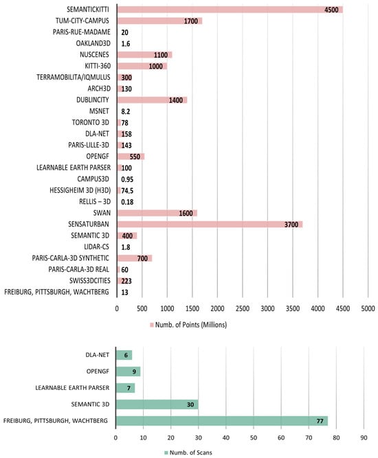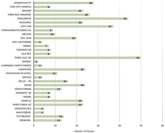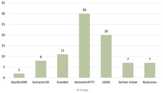 After a careful examination of the available outdoor 3DSS datasets, it was concluded that a large variety of sensors is used to map the outdoor 3D environment providing raw 3D point clouds. Specifically, there are datasets created either using terrestrial, aerial, or mobile laser scanner–LiDAR [36,38,39,41,43,44,45,46,48,49,50,51,52,53,54,55,56,57,58,59,60,61,62,63,64,65,66,67], photogrammetry [37,40,42,44,47], or even using mobile range finders [36]. For instance, several datasets have been created using Velodyne LiDAR [36,38,39,50,53,60,61,64,66,67], Oyster LiDAR [43,44,45], Riegl LiDAR [46,51], DSLR cameras [46,57,58], and Unmanned Aerial Vehicles (UAVs), along with their built-in cameras [37,42,47,58], etc. In general, each outdoor dataset provides both similar and different information compared to the others. For example, providing data of the same area but with different resolution (500 k, 15 M, 223 M points) [37], using a tilted LiDAR acquisition process [38], capturing multi-temporal [46] or multimodal data [40], and data for a specific application such as the classification of cultural heritage monuments [58] or the semantic segmentation of facades [51]. Additionally, each photogrammetric dataset has a different Ground Sampling Distance (GSD), and each LiDAR dataset has a different ratio of pts/m2, both of which play a significant role in each application (Table 2). In Figure 3, the number of the available classes, images, and scans are displayed for each dataset. Finally, in Figure 4, the statistics about the usage of the indoor and outdoor datasets is presented based on the examined SoTA methods in Section 5.
