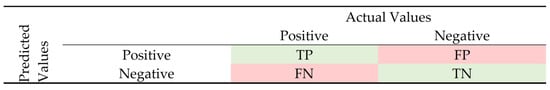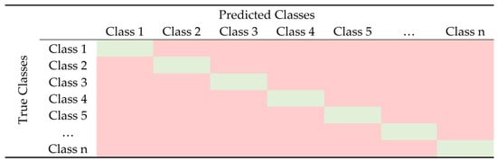 Comparing the predicted values with the actual values, the TP, FP, FN, and TN values could be derived forming the confusion matrix. While in Figure 5, a 2 × 2 confusion matrix is presented, most of the time, there are more than two classes, e.g., n, and hence, the confusion matrix could be an n × n matrix regarding the number of them. In Figure 6, an n × n confusion matrix is presented. The TP, TN, FP, and FN values can be derived by examining the n × n confusion matrix for each class. For instance, for Class 3, the TP are defined by the value included in cell (3,3), the FP are defined by adding the values of the third column, excluding cell (3,3), the FN are defined by adding the values of the third row, excluding the cell (3,3), and, finally, the TN are defined by subtracting the TP, FP and FN from the total instances.