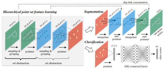 Up to the presentation of the PointNet [68] architecture, the extraction of 3D point cloud features was performed manually. PointNet [68] was the first architecture that enabled the extraction of deep learning features directly using 3D point clouds. To be more specific, the input of the PointNet architecture was a point cloud with n × 3 dimensions. Firstly, the authors introduced the T-Net, which learns to transform the given point cloud, e.g., rotate, translate, and change its scale. Secondly, the transformed point cloud was fed into multiple shared Multi-Layer Perceptrons (MLPs), resulting in a point cloud with n × 64, i.e., local features, dimensions that finally were transformed to n × 1024 dimensions, i.e., global features. Thirdly, the max-pooling operation was applied on the n × 1024 point cloud, selecting the maximum value between the 1024 values. The idea was that the maximum value was independent to the values order; thus, it handles the unorder characteristic of point clouds. However, PointNet has several limitations, such as its inability to exploit the information of the local structures in point clouds. Hence, Qi et al. (2017) [69] proposed an extension of PointNet called PointNet++. The main contribution of PointNet++ was the proposed hierarchical structure that decodes the information of point clouds using three abstraction levels. The first one was implemented by the Sampling Layer, which finds the centroids of local regions by subsampling the given point cloud using the Farthest Point Sampling (FPS) algorithm. The second one was implemented by the Grouping Layer, which creates point neighborhoods using the Ball Query algorithm. Each point in the neighborhood was defined with relative coordinates to the neighborhood centroid, achieving the extraction of the neighborhood’s local characteristics. Finally, the PointNet++ architecture, presented in Figure 7, used several mini-PointNet layers to extract meaningful features from the point sets. PointNet++ used several abstraction levels for the feature extraction, i.e., on multiple scales, and thus achieved the extraction of both fine-grained and global features, resulting in an improved version of PointNet.