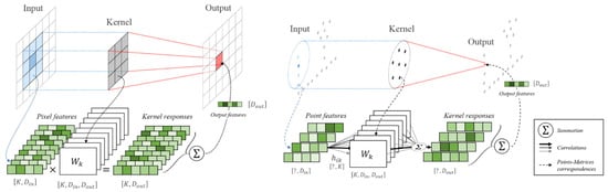 Thomas et al. (2019) [73] presented the Kernel Point Convolution (KPConv) architecture, which was inspired from the typical 2D convolution operator. A comparison between image convolution and KPConv convolution is presented in Figure 8. Specifically, KPConv weights were carried by the 3D points in Euclidean space in the same manner as the features. In general, the rigid KPConv operator was applied on the 3D points close to the convolution location. To be more specific, the neighborhood of the convolution location was defined using a specific radius. The KPConv operator took as an input the neighborhood of points with coordinates relative to the convolution location. The convolution kernel was defined by points that were linked with their weights and aimed to transform the features of the given neighborhood points to a new set of features. Specifically, the transformation of feature dimensions was performed using a correlation function between the input and the kernel points. The authors used the linear correlation function. Additionally, they presented a comparison between the Gaussian correlation and the linear correlation to support their choice. Moreover, the authors proposed a deformable version of the KPConv operator, which considered the local geometry of the points by applying different shifts at the convolution location. In fact, the convolution location was critical for the proposed operator. Furthermore, the authors included grid subsampling to handle the varying density issue of some 3D point clouds, explained the pooling layer and the KPConv layer, and then analyzed the selection of the network parameters. Finally, the authors proposed two architectures. The first one was about classification, while the second one was about segmentation. To be more specific, the segmentation architecture included the classification architecture in the encoder part, while the decoder part applied nearest upsampling in combination with skip connections between the encoder and decoder features. To conclude, the proposed KPConv architectures were evaluated on different benchmarks for classification and segmentation purposes.