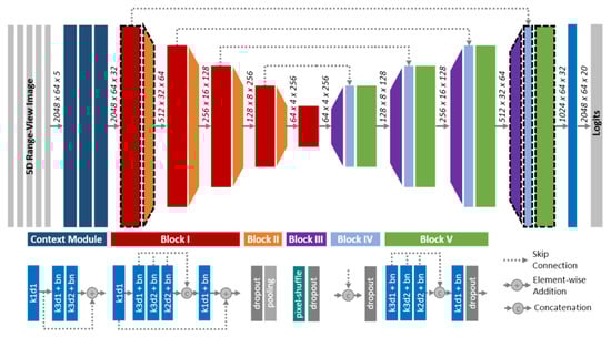 - Xu, C.; Wu, B.; Wang, Z.; Zhan, W.; Vajda, P.; Keutzer, K.; Tomizuka, M. SqueezeSegV3: Spatially-Adaptive Convolution for Efficient Point-Cloud Segmentation. In Computer Vision—ECCV 2020, Proceedings of the 16th European Conference, Glasgow, UK, 23–28 August 2020, Proceedings, Part XXVIII 16; Vedaldi, A., Bischof, H., Brox, T., Frahm, J.-M., Eds.; Lecture Notes in Computer Science; Springer International Publishing: Cham, Switzerland, 2020; Volume 12373, pp. 1–19. ISBN 978-3-030-58603-4. [Google Scholar]