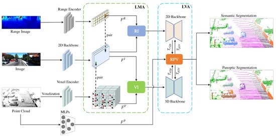 - Yan, X.; Gao, J.; Zheng, C.; Zheng, C.; Zhang, R.; Cui, S.; Li, Z. 2DPASS: 2D Priors Assisted Semantic Segmentation on LiDAR Point Clouds. In Computer Vision—ECCV 2022, Proceedings of the 17th European Conference, Tel Aviv, Israel, 23–27 October 2022, Proceedings, Part XXVIII; Springer Nature: Cham, Switzerland, 2022. [Google Scholar]