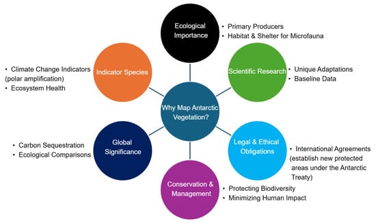 Antarctic Specially Protected Areas (ASPAs) were first established in 1964 under the Agreed Measures for the Conservation of Antarctic Fauna and Flora [1] to ensure the protection of biodiversity and the minimisation of human impact. Not only is the mapping of flora important for the monitoring of these sites, but mapping outside of these areas can help to identify vulnerable areas that should be established as new ASPAs. Vegetation such as moss and lichen provide crucial habitat and shelter for microorganisms and small invertebrates and as such are critical primary producers in Antarctic ecosystems [2]. Mapping this vegetation is key for providing baseline data for tracking ecological changes [3] and conducting studies to investigate the unique adaptations of this vegetation for surviving in extreme climates [4]. A synthesis of other key factors on why it is critical to map vegetation and monitor its health condition in Antarctica is shown in Figure 1.