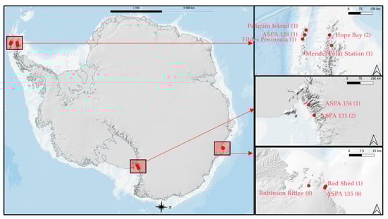Locations of Antarctic vegetation studies as listed in Table 2. The number of studies conducted at those sites is included in parentheses.