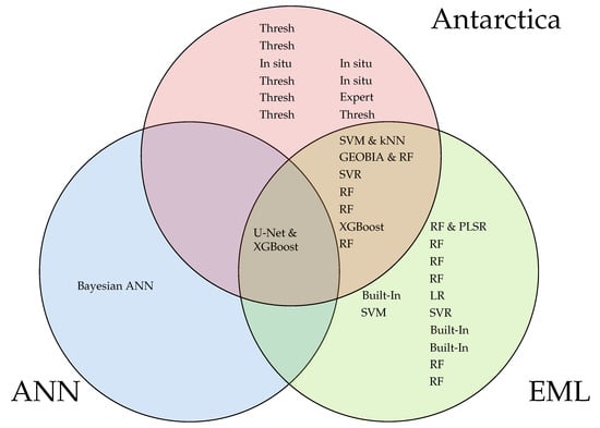 Venn diagram contrasting Uncrewed Aerial Vehicle (UAV) vegetation mapping methods in polar environments. ANN: Artificial Neural Network, EML: Established Machine Learning, Thresh: vegetation index thresholding, Built-in: segmentation algorithms built-in to mapping software, In situ: classifications made by experts in the field, Expert: expert scientist labels images, SVM: Support Vector Machine, SVR: Support Vector Regression, kNN: k-Nearest Neighbours, GEOBIA: Geographic Object-Based Image Analysis, RF: Random Forest, XGBoost: eXtreme Gradient Boosting, LR: Logistic Regression, PLSR: Partial Least-Squares Regression. Relevant references: Thresh: [6]; Thresh: [31]; In situ: [35]; Thresh: [29]; Thresh: [41]; Thresh: [13]; RF: [65]; XGBoost: [40]; RF: [34]; RF: [37]; SVR: [33]; GEOBIA & RF: [38]; SVM & kNN: [36]; Bayesian ANN: [44]; U-Net & XGBoost: [15]; RF: [47]; Built-In: [43]; LR: [52]; RF: [48]; SVR: [33]; RF: [50]; RF: [49]; Built-In: [46]; Built-In: [45]; SVM: [7]; RF: [42]; RF & PLSR: [51]; In situ: [35]; In situ: [31]; Expert: [6]; Thresh: [13].