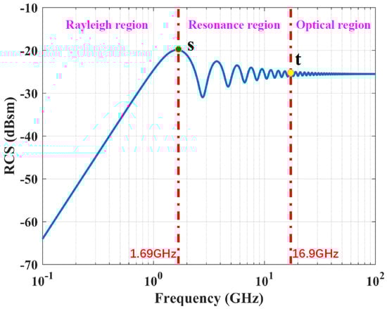 The division of the polarization scattering regions into and is consistent with the demarcation points of the single-polarization RCS scattering regions. As mentioned in Section 1, the boundary between the Rayleigh region and the resonance region is , and the boundary between the resonance region and the optical region is approximately . For a sphere with a radius of cm (shown in Figure 2b), the frequencies at the boundaries between the Rayleigh region, the resonance region, and the optical region are GHz and GHz, respectively.
