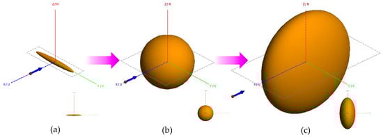 , , and represent the lengths of the , , and semi-axes, respectively. An ellipsoid’s shape varies depending on the relationship between these axes. When two of these axes share the same length L, such as as illustrated in Figure 2, the ellipsoid takes the form of a spheroid. This is known as an ellipsoid of revolution. In this scenario, the ellipsoid remains unchanged under rotation around the third axis. When the third axis is the longest, with , it assumes the shape of a prolate spheroid, as depicted in Figure 2a. If all three axes are equal in length, with , the ellipsoid transforms into a sphere, as shown in Figure 2b. Conversely, if the third axis is shorter, with , the ellipsoid takes on the form of an oblate spheroid, as seen in Figure 2c. The front views of the simulated ellipsoid models are in the lower right corners of Figure 2a–c.