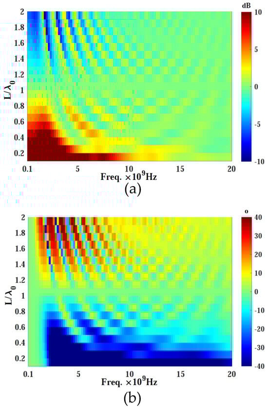 Electromagnetic computational simulations were performed using the software Altair FEKO 2020 with the multilayer fast multipole algorithm (MLFMA) [30], a full-wave method. In order to expedite the simulation process, a segmented simulation was utilized, with the first frequency range being from GHz to GHz and the second range being from GHz to 20 GHz. Specifically, the range of L in the simulation was from to , with a step size of . The frequency range was from to , with a step size of .