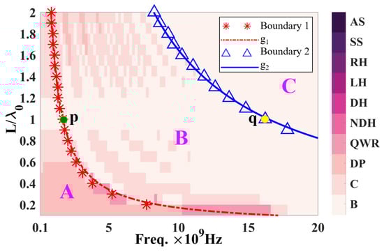 In particular, when , the frequencies corresponding to the Cameron decomposition results are around GHz (the green point “p” in Figure 6, corresponding to the green point “s” in Figure 1) and GHz (the yellow point “q” in Figure 6, corresponding to the green point “t” in Figure 1), respectively, with errors of and . These errors may have two sources: firstly, the classification of each region is gradual and there is no absolute standard point; secondly, the simulation sampling points are not dense enough. However, these errors are acceptable in practical engineering applications. Firstly, the classification of each region is inherently gradual, without sharply defined boundaries, as the transitions between the Rayleigh, resonance, and optical regions occur continuously. This lack of absolute standard points can introduce variability when aligning theoretical boundaries with the observed scattering characteristics, particularly in regions where changes in scattering behavior are subtle. Secondly, the density of simulation sampling points may not be sufficient to capture these fine transitions accurately. Coarser frequency steps or axis ratio intervals can lead to small but impactful discrepancies near the boundaries. Enhancing the sampling resolution or refining the classification criteria would help minimize these errors and yield more precise boundary determinations. Therefore, the proposed polarization scattering regions is an extension of the concept of single-polarization RCS scattering regions.