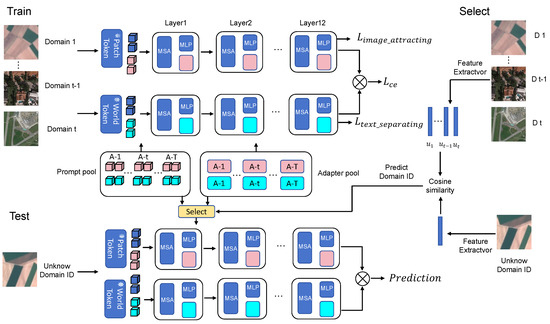 Methods based on prompts are widely used in the fields of NLP [50,51,52] and CV [15,53,54]. L2P [55] has pioneered the integration of prompt learning into the field of continual learning. It proposes a key–query-matching strategy to select prompts from a prompt pool, which are then incorporated into pre-trained models. Later research expands upon this key–query-matching approach. DualPrompt [56] utilizes a set of task-specific prompts and dynamically selects the most relevant one during inference based on the similarity between the input and these prompts. By designing different prompts for different tasks, this method allows the model to choose the most suitable prompt based on the characteristics of the input, thereby improving its performance and adaptability in multi-task scenarios. Recent developments have further advanced prompt-based methods. VPT [15] introduces visual prompt tuning, which adapts pre-trained vision models to downstream tasks by prepending trainable tokens to the input sequence. This approach maintains the frozen backbone while achieving competitive performance through lightweight prompt optimization. CPT [57] proposes conditional prompt tuning that generates dynamic prompts based on input conditions, enabling more flexible and context-aware feature extraction. Additionally, Prograd [58] introduces a gradient-based prompt selection mechanism that automatically determines the most relevant prompts through gradient analysis, reducing the computational overhead of traditional key–query matching. CODA [59] applies key–query matching to assign weights to prompts, facilitating end-to-end optimization. This weighted approach allows for more nuanced prompt selection and better handling of ambiguous cases. S-Prompts [16] focuses on domain incremental learning by collecting distinct prompts for each domain and using KNN to select the appropriate prompt during inference. Building upon this, MPT [60] proposes a multi-modal prompt tuning framework that leverages both visual and textual prompts to enhance cross-domain adaptation capabilities. In the context of efficiency and scalability, recent works have explored lightweight prompt architectures. Adapter-Tuning [61] combines prompts with efficient adapter modules to reduce parameter overhead while maintaining performance. Similarly, Tip [62] introduces a learning-free inference technique that significantly reduces computational costs during inference while preserving the benefits of incremental learning. For multi-layer fusion methods in CNN-based remote sensing scene classification: Chen et al. [63] proposed a multi-scale feature fusion network that hierarchically combines features from different CNN layers to enhance scale-invariant representation. Xu et al. [64] introduced a pyramid feature attention network (PFAN) that effectively fuses multi-scale features with attention mechanisms. Yuan et al. [65] developed a deep feature fusion framework that integrates both shallow and deep features through adaptive weight learning. Regarding attention-based CNN methods: Hou et al. [66] designed a spatial-channel attention module specifically for remote sensing scene understanding. Cui et al. [67] proposed a dual-attention fusion network that simultaneously captures spatial and channel dependencies. Kim et al. [68] introduced a multi-attention feature fusion network that selectively emphasizes informative features across different scales. Domain incremental learning has emerged as a crucial paradigm for adapting models to new domains while preserving performance on previously learned domains [69]. Traditional DIL approaches primarily rely on knowledge distillation and regularization techniques to mitigate catastrophic forgetting. For instance, learning without forgetting (LwF) employs knowledge distillation to preserve responses on old domains while learning new ones. However, these methods often struggle with the stability–plasticity dilemma, leading to suboptimal performance across domains. More recent approaches have explored parameter-efficient adaptation strategies. Adapter-based methods [70] introduce small, domain-specific modules while keeping the backbone network frozen. While these methods show promise in parameter efficiency, they typically lack mechanisms for explicit domain-aware feature learning, potentially limiting their effectiveness in capturing domain-specific characteristics. Our DACL framework advances beyond these existing approaches in several key aspects. Unlike conventional DIL methods that focus solely on preventing forgetting, DACL actively promotes domain-aware feature learning through contrastive learning. We introduce a novel dual-adaptation mechanism that combines both domain-specific and shared adaptations, enabling more flexible and efficient domain adaptation. Our approach maintains a better balance between domain-specific feature learning and cross-domain knowledge transfer, addressing the limitations of previous adapter-based methods.