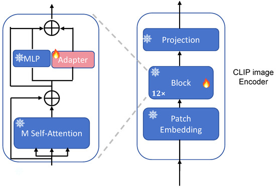 where denotes the original image tokens and represents the classification token inherited from the CLIP image encoder. This extended embedding sequence serves as input to the Transformer blocks, maintaining the CLIP image encoder processing pipeline.